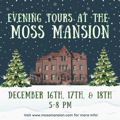 The Moss Mansion is closed for Christmas. We will reopen December 26th with our regular tour hours of 12-4 pm.
